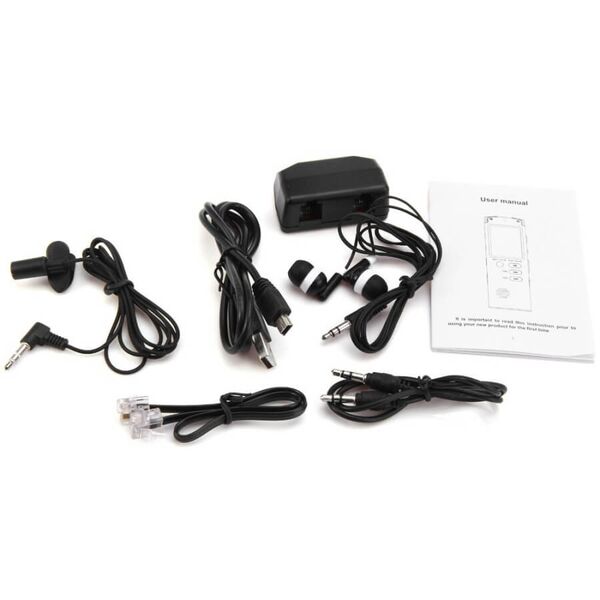 Package Contents: 1 x T60 2 in 1 LCD Real Time Display 8GB Digital Voice Recorder MP3 Player, 1 x USB Cable, 1 x External Microphone, 1 x RJ45 Cable, 1 x 3.5mm Audio Cable, 1 x Earphone, 1 x Telephone Adapter, 1 x English User Manual